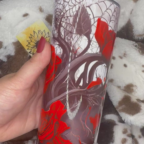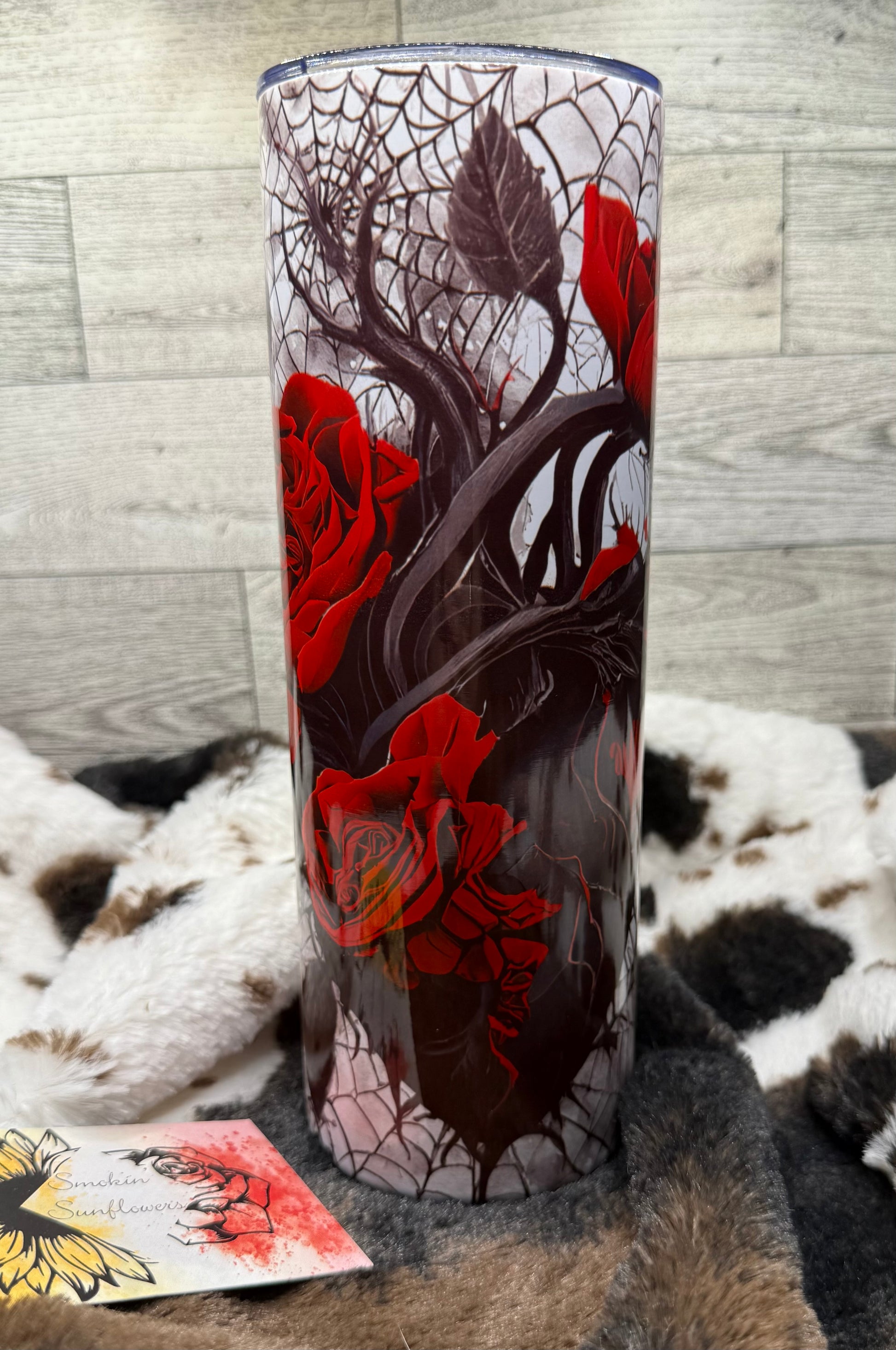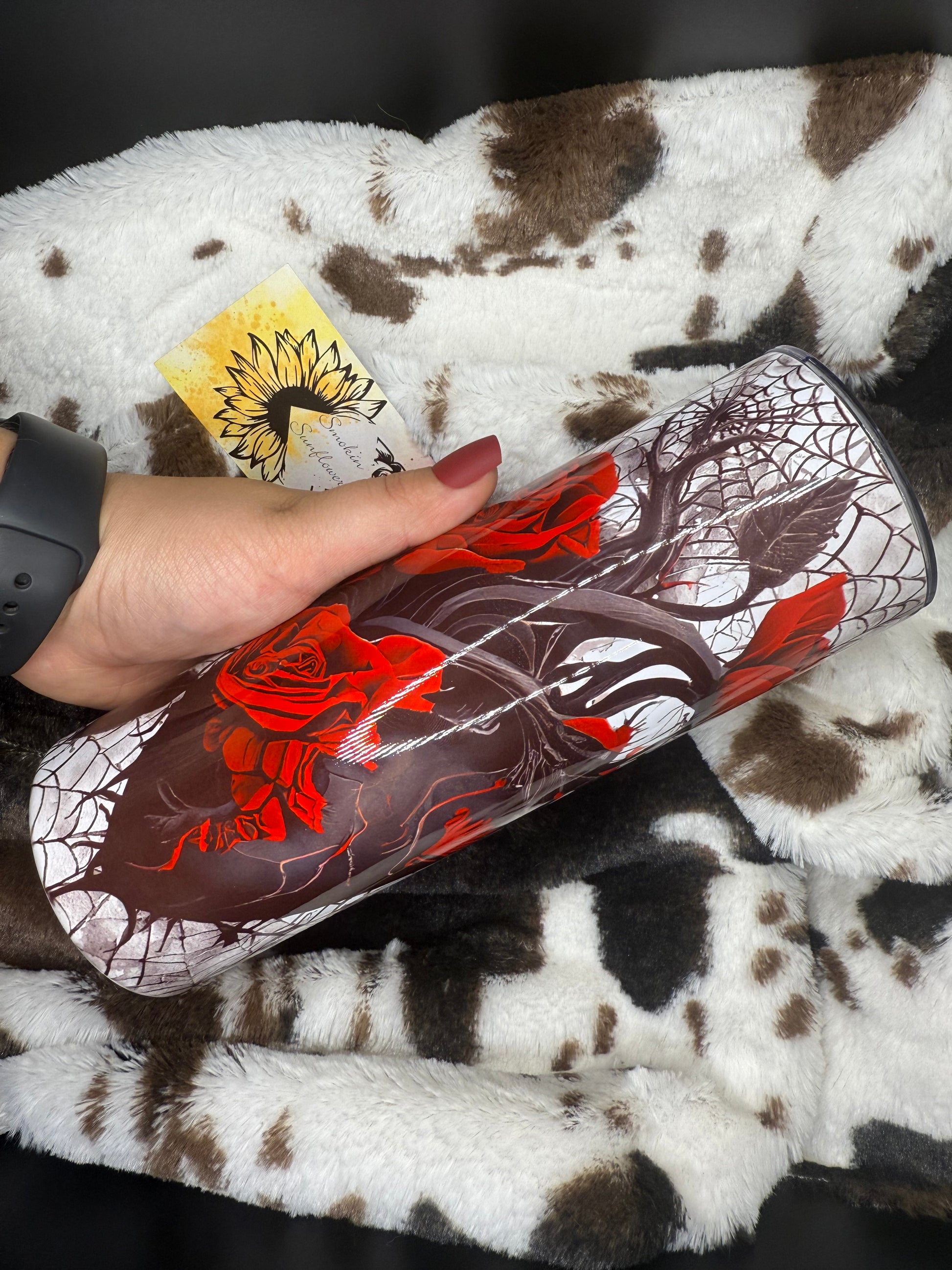 Embrace your dark side with this hauntingly beautiful Gothic Rose Tumbler. Featuring striking red roses intertwined with dark vines against a backdrop of delicate spiderwebs, this tumbler is perfect for those who appreciate the beauty in the macabre. The double-walled, stainless steel design keeps your drinks hot or cold for hours, while the included BPA-free lid prevents spills. Whether you're sipping on a chilling iced coffee or a warming potion, this tumbler adds a touch of gothic elegance to your everyday routine.